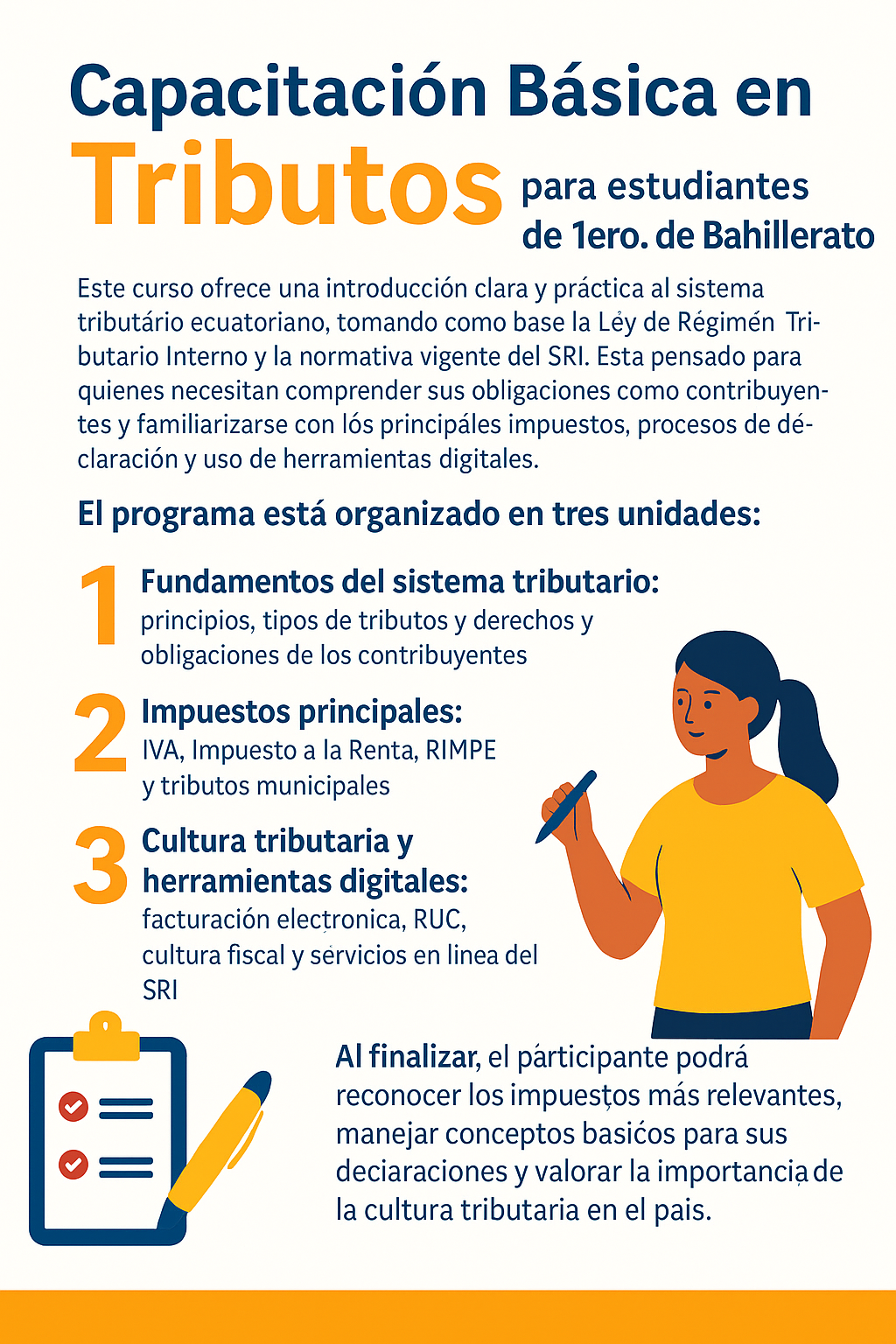 Este curso ofrece una introducción clara y práctica al sistema tributario ecuatoriano, tomando como base la Ley de Régimen Tributario Interno y la normativa vigente del SRI. Está pensado para quienes necesitan comprender sus obligaciones como contribuyentes y familiarizarse con los principales impuestos, procesos de declaración y uso de herramientas digitales.
